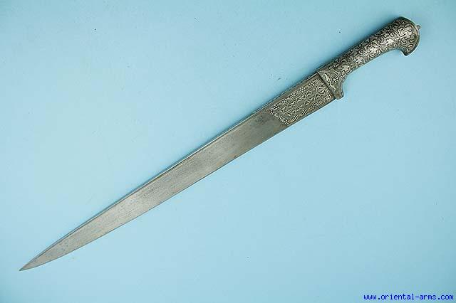 This is a very good example of the famous Khyber sword coming from India. Mid to late 19 C. The heavy blade is 24 inches long is decorated with silver Koftgari inlay work. Steel hilt with silver inlaid floral decoration. Total length 29 inches. Very good condition. Very impressive sword. |
