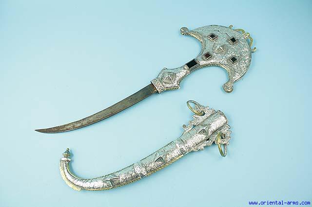 Up for sale is this Koumaya dagger of unusual dimensions: 24 inches, compared to 16 – 17 inches "common" size. Pommel of huge dimensions: 10 inches long and 9 inches wide. The style of this dagger is also known as: Chapeau de Gendarme (The hat of the policeman) after the shape of the pommel . Blade of typical shape but larger than usual, 12 inches long. Both handle and scabbard are brass, covered with thin silver sheet on the front face, chased and engraved. The wide pommel is set with four colored glass squares. The actual use of such big Koumaya dagger is a mystery: It is definitely old, early 20 C. and not a tourist souvenir. Is it for ceremonial use? or may be an advertisement for a Koumaya maker?? In any case it is an unusual and interesting authentic item. |