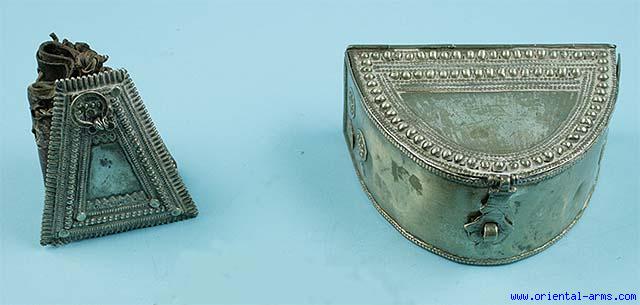 Text: This two bullets containers are Yemeni, early 20C. Originally part of ammunition belt (now missing). Metal (Silver ?) and leather construction. The big one is 5 inches long, signed and marked. Very good condition.
