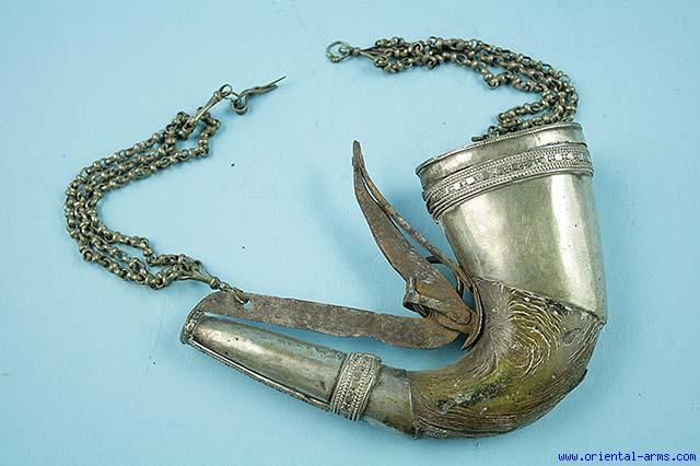 This 19C flask is Arab, late 19 C. Dated to 1300 (or 1313), 1882 (or 1895) in the Gregorian calendar. Horn base and silver mounts. Steel spring. Marked 13 (Either 1300 or 1313 for the date). Good condition