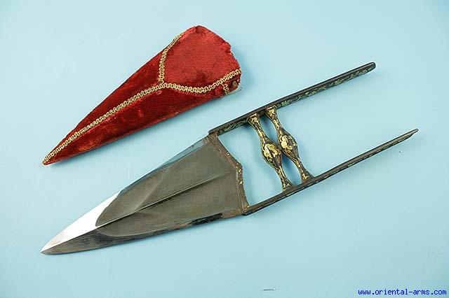This fine Kattar push dagger is Indian, North India, mid 19C. Employing a finely forged wootz (Watered) steel blade with good high contrast pattern. The handle side bars and cross bars are finely inlaid with gold in a floral pattern. Wood scabbard covered with red velvet. Blade 8 inches long 3 1/2 inches wide. total 15 1/2 inches. Very good condition. |