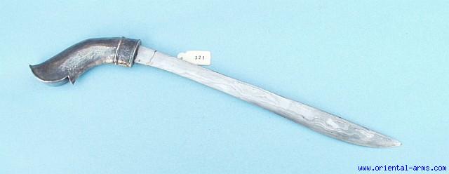 The Badek (or Badik) is a dagger / short sword from Java, Indonesia. It is characterized by its single edge blade with straight back and up-curving edge, and the pistol grip shape handle. This one has a 10 inch blade beautiful pattern welded (Damascus) steel and silver handle. No scabbard. Very good condition, with all part original, authentic without replacement or restoration. Very low price. |