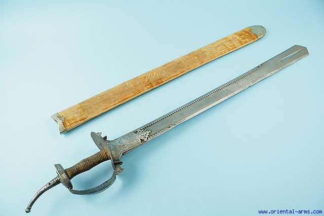From India, mid 19C. good fighting Khanda. Wootz blade 25 inches long 2 1/2 inches wide, pierced at the tip (May be from excess etching). Classical cup handle with long pommel spike, decorated with silver koftgari work. Grip bound with leather. Fabric covered scabbard with white metal mounts. Total length 34 1/2 inches. Very good condition. Blade needs a good polish and etch to bring out the steel pattern. |