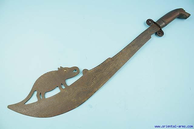 rare ceremonial sword from Dahomei (Benin). late 19 - early 20C. 23 inches long blade with an animal image cut in the tip of the blade, with brass eyes. Blade engraved with snake. Wood handle with animal head pommel and coiled steel cross guard. Total length 28 inches. Very good condition. Heavily patinated blade. |