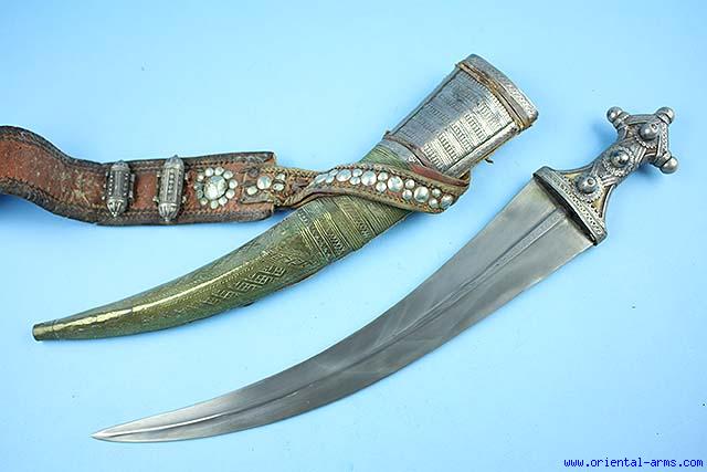 This massive Jambiya dagger is early - mid 20 C. coming from the Western regions of Arabia, Hijaz and Asir. The big and heavy blade is 17 inches long, 3 inches wide, very well forged with a shallow central rib. Horn grip mounted with heavy silver mounts all around. The scabbard is covered with brass and silver. Original leather belt bound to the scabbard with twisted brass wires and decorated with white metal tacks. Total length 23 inches. Very good condition. A massive and very impressive authentic dagger. |