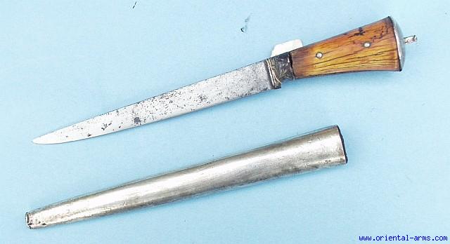 This knife comes from East India, probably from the state of Orissa. It is quite rare and characterized by the short slender blade and big conical ivory handle. This exemplar has a blade of 7 inches long, quite narrow, ¾ inches wide. Ivory grips with silvered covered pommel and silver decorated bolster. Wood scabbard covered with silver sheet. Good condition. Good age patina on the ivory with minor damage near the bolster. |