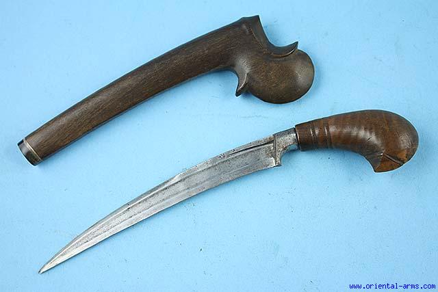 A Korambit style dagger, Late 19 - early 20 C. Heavy down curving fullered blade 6 inches long with 3 1/2 inches back edge. Carved wood handle and scabbard. Total length 9 inches. Sumatra. Sometimes referred to as Lawi Ayam. Authentic piece.