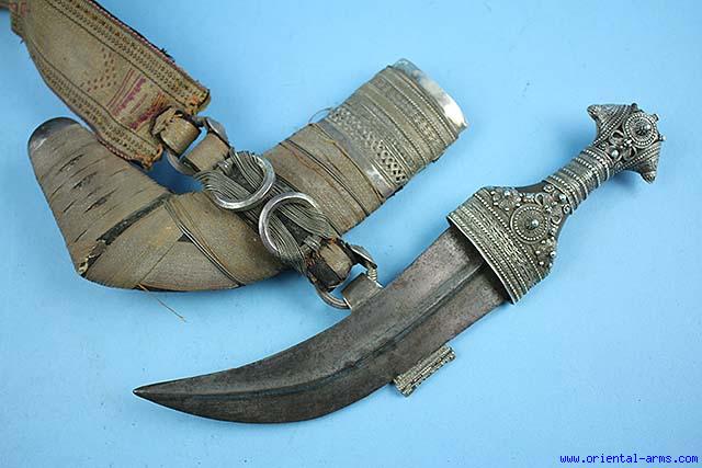 From our private collection comes this very fine quality Arab Jambiya dagger from Oman, in the royal style known as Saidi . It has a well forged, 8 inches long, 2 ½ inches wide, curved and dual edge blade with a central rib. The hilt is made of Rhino horn in the classical “I” shaped, decorated with many small silver filigree pieces. The scabbard is “L” shaped covered with fabric . The belt attachment is made of complicate arrangements of 4 silver rings and twisted silver wire. All scabbard and hilt fittings are silver chased in a typical design. This item comes with its original 2 inches wide embroidered belt in gold and red colors, and a silver buckle (Partly damaged). Very good plus condition. |
