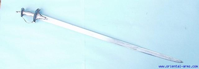 Up for sale this unusual sword of good quality, Straight and slender blade forged from good high carbon steel, probably of laminar construction. The blade is 33 inches long with 10 inches false edge, marked on the spine with an armory catalog number in punch design (common to swords from Rajasthan). Whole steel handle, of the shape common in Tulwar swords, but with a side plate protruding out to protect the fist. Total length 39 inches. Very good condition. This sword comes with a newly made scabbard covered with fabric (not shown). |