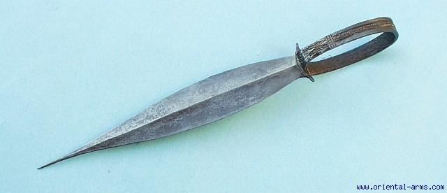 A loop dagger of the TIV people residing on the Niger river in Nigeria. Very typical but unusual whole still construction with the ring hilt forged in one piece with the blade. Leaf shaped 8 inches blade of flat hollow ground cross section with a central rib and acute tip. Filed and chiseled ring handle10 ½ inches total length. Very good condition. Quite unusual and very elegant piece. |
