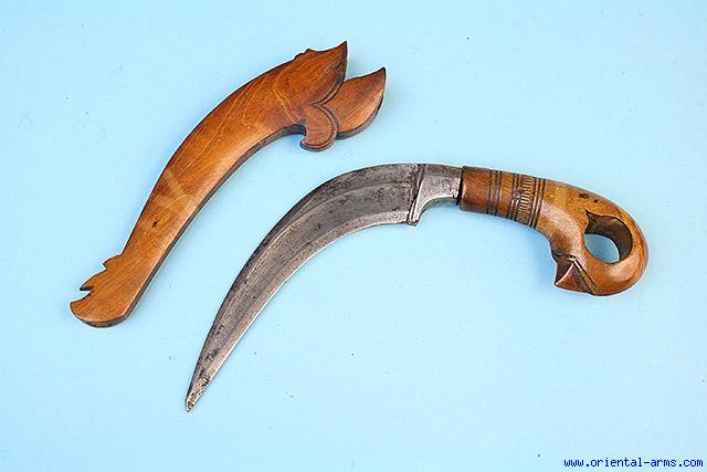 This Korambi curved dagger comes from Sumatra, late 19 C. Finely forged blade with thick spine and long fuller, deeply curved claw shaped 5 1/2 inches long. Polished wood grip with thumb hole and polished wood scabbard. Total length 8 inches. Very good condition. Small wood chip on the spine of the scabbard. |