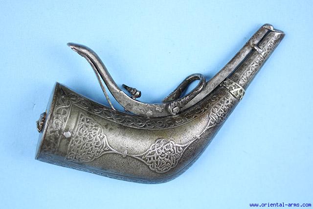 Persian, 18 C. whole steel powder flask. Finely etched with calligraphy in Arabic letters and dated 1212 ( 1797 in the Gregorian calendar). Full working order. Length 5 ½ inches. Very good condition. Minor opening in the seam. A silver band on the throat may indicate an old repair. |