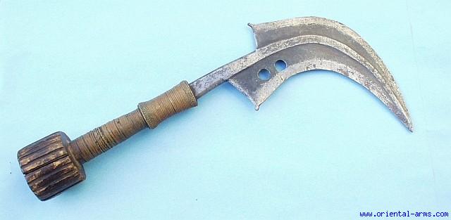 The knife of the Mangbetu people residing in Central Africa was originally used as a weapon of war and also as an agricultural implement, but later on developed into luxury item and a symbol of status. One of the photos show a drawing from the late 19 C. of Munza the king of the Mangbetu on his crown, holding high a similar knife as a symbol of power and authority. This one is a late 19 or early 20 C. piece, sickle shaped. 9 12/ inches (point to point) blade, 16 inches total length (tip of blade to pommel). The handle is wood bound with plain and twisted copper wires and the pommel is ribbed. Very good condition, Original blackened color of the blade and very good age patina on the handle. |