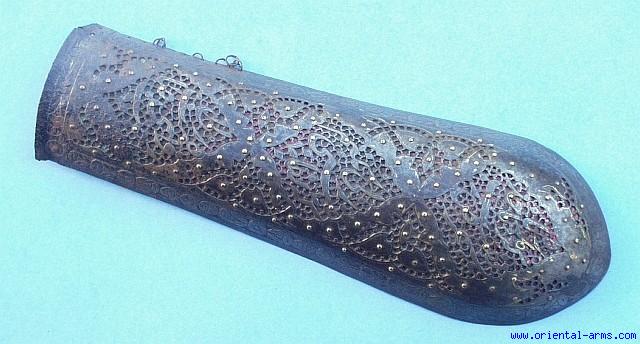 A very interesting and beautiful Indo Persian Bazu-Band (Arm Guard) from the 1850’s. 12 inches long and 4 inches wide, whole steel, in elaborate pierced design and brass nails, with Arabic calligraphy, inlaid in gold and silver koftgary decoration. Very good condition. The internal fabric cushion is missing. |