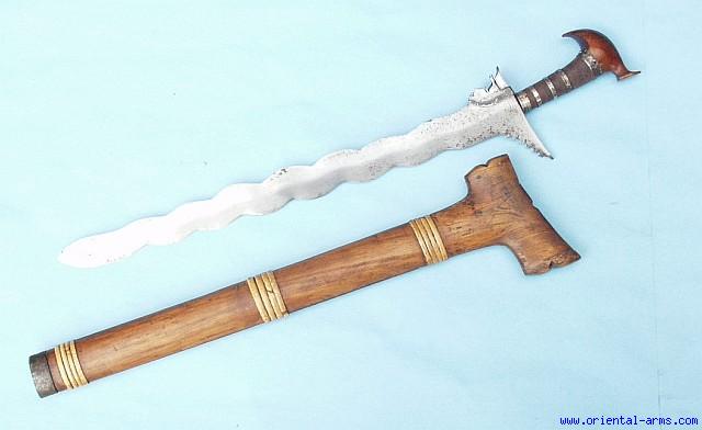 This is a very good exemplar of an early 20 C. Moro Kris from the Philippines. The waving blade is 20 inches long. Hardwood handle bound with fibers and silver bands. Silver clamp (Baca-Baca). Wood scabbard. 26 inches total length. Very good condition. Several old repaired cracks in the scabbard done with many wood nails. Very Low Price. |