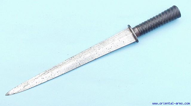 this beautiful dagger has a blade of flat diamond section tapering to acute point, 12 ½ inches long. Beautifully carved horn handle in a spiral shape. Oval steel cross guard. Exact origin unknown.