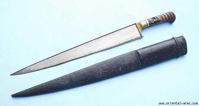 We offer for sale this superb fine 18 Century Indo-Persian Khyber sword. A very fine 16 ½ inches long 2 inches wide, single edge blade with pronounced T spine, forged from very fine wootz (Damascus) steel. Ribbed horn grips with heavy steel bolsters, beautifully decorated with gold koftgari floral design. Wood scabbard covered with delicately tooled leather. Good condition. The horn grip has small beetle damages. The scabbards leather is lightly worn. A fine piece of quality, for the advanced collector .
