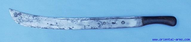 This is a very impressive African machete incorporating a good Solingen blade, stamped with a styled sun, moon and seven stars. A similar signatures appears on Solingen blades made for export at the second half of the 19th Century. 21 ½ inches long, 2 inches wide, up-curving blade, horn grips riveted to the blade tang. Good plus condition with minor blackened areas and pitted spots. Few nicks on the edge. Unusual piece for the collector of African weapons / implements offered here at a very attractive price. |