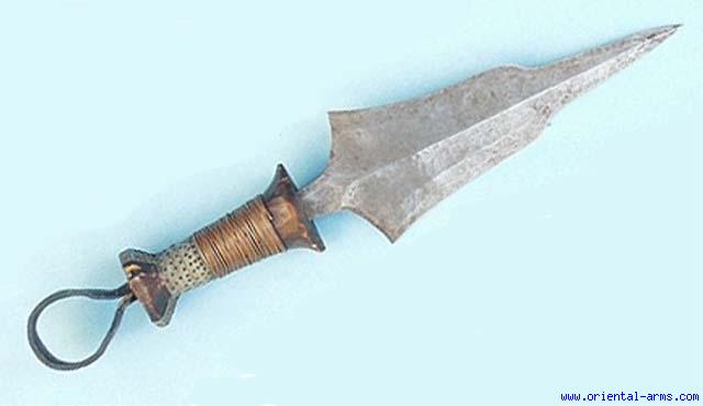 Up for sale is this fine dagger of the Tetela tribe residing in the very heart of the rain forest in central Zaire (Africa). Rare in its close to excellent condition. The blade is forged from fine steel 8 inches long 3 inches wide with a central rib and ending with an acute tip. Wood handle bound with copper wires and decorate with Zinc (?) strips. The pommel has a shape of a big steel ring. Very good condition.