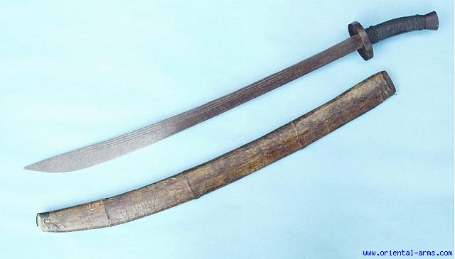 Up for sale this Chinese sword also known as Ox Tail Saber. 30 ½ inches fullered blade widening toward the tip. Wood handle covered with black thread with steel pommel and steel disk shaped cross guard. Wood scabbard covered with leather and mounted with a brass tip. Fair condition. Very reasonable price. |