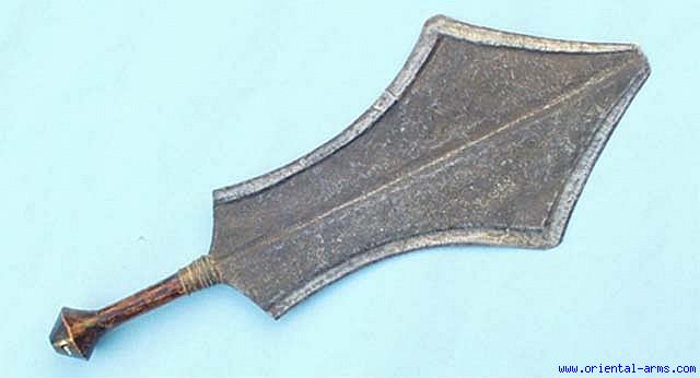 The origin of this knife / dagger is a bit obscure. It is definitely central Africa, probably central Zaire, may be Kota (?).Nevertheless, it is very impressive in its dimensions, shape and quality. The blade is 14 inches long, widening to more than 8 inches at its widest point. Total length 20 inches. Very good quality in terms of African weaponry. Good forging and reinforced edges and central rib. “scratched” lines decoration. Wood hilt partially covered with copper strips. Excellent condition. The very good original black patina on the blade and natural dark brown patina on the wood grip indicate an old age, probably mid 19 C. All parts original and authentic. The white painted number on the pommel indicate it is coming from a museum or other important collection. |