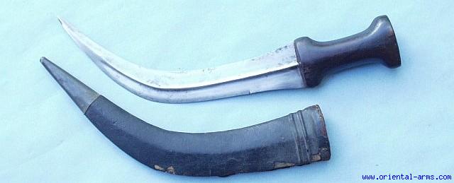 An unusual big 19C. Jambiya dagger from India. The curved blade is 12 ½ inches long (compared to the usual 7-8 inches). It has a central rib and thickened tip. The hilt is classical I shaped made from dark red brown wood. The scabbard is wood covered with black leather. The tip is steel (A recent replacement). Very impressive blade in good condition with minor pitting only. The scabbard is slightly damaged and one of the side seams is partially open. Few leather pieces are missing. It is offered here at a very low price, less than the blade value only. |