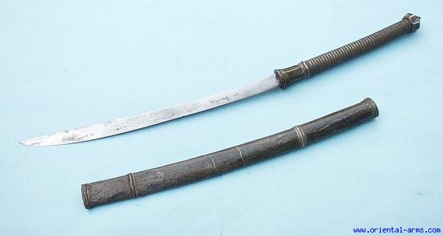 A Classical silver covered two handed fighting sword Dha from Thailand. The slightly curved heavy blade is 17 inches long. The grip is wood, 11 inches long and entirely covered with beautiful silver rings , ending with onion shape pommel. Wood scabbard also bound with silver. Good condition. Nice black age patina to the silver.Minor nicks on the blade and damage to the scabbard silver cover. The handle lower part and scabbard mouth are slightly distorted. |