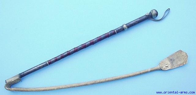 This magnificent riding whip is coming probably from the Caucasus. The silver handle is decorated in Niello design. The shaft is nound with spiral silver band and the whip is braided hide. Total length (open) 36 inches. Very good workmanship of the 19 century in very good condition. |