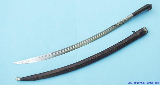 This heavy and impressive sword is a very rare form of a Yatagan, employing a saber curved blade. 29 inches long with a 8 ½ inches back edge. Horn grips with eared pommel in a style reminding the Greek Yatagans / Daggers. Silver bolster and grip strap. Leather covered scabbard with silver fittings. All in very good plus condition. Minor pitted spots near the blade tip and an old leather patch on the scabbard tip. All parts original and authentic. A very rare piece for the serious collectors of Yatagans. |