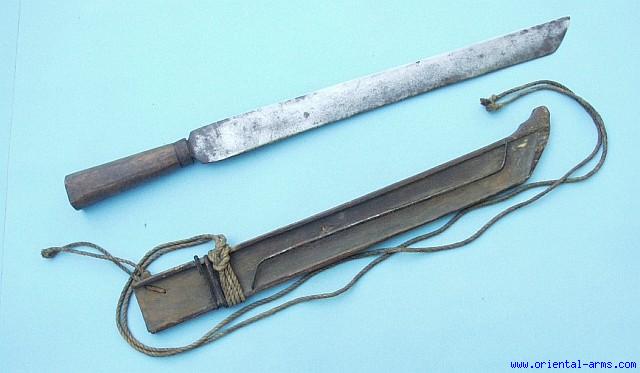 Up for sale is this very rare long knife / machete from the aborigine tribes of Taiwan (Formosa). The single edge blade is 15 ½ inches long, 1 ½ inches wide. Hardwood grip with steel collar. Open side scabbard with a steel wire holding the blade in the scabbard. This knife is coming with its original string used as a belt. Total length 21 ½ inches. Very good condition. |