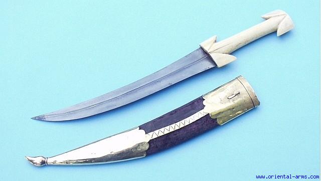 We offer for sale this 19 C. very nice Ottoman / Balkan (probably Albanian) Jambiya dagger, with very large 11 inches blade forged from fine Wootz (Damascus) steel. Long handle cut entirely from a single piece of walrus ivory with extended pommel and cross guard corners, attributed to Albania. Wood scabbard covered with the original dark red velvet fabric and fitted with very nice gilded silver locket and chape. Total length 19 inches (in scabbard). Very good condition. The age crack on the grip is very old and the grip is very solid. A very impressive item and one of quality.
