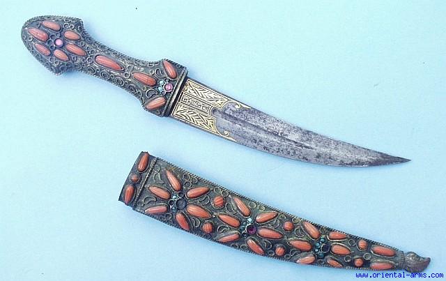 A very typical small curved dagger from the late 18 or early 19 C. The curved blade is 5 ½ inches long and decorated with gold koftgari inscription in Arabic letters. The hilt and scabbard are copper, front side is gilded and set with corals and tiny turquoise stones. There are more than 39 corals set in this piece . The rear side of the hilt and the scabbard are made of chased copper. This type of decoration was common in the 18 C. in the eastern parts of the Ottoman Empire. Very good plus condition. |