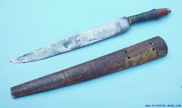 Up for sale is this fine and very rare long knife / machete from the aborigine tribes of Taiwan (Formosa). The single edge blade is 15 inches long, 1 ½ inches wide. Hardwood grip painted red and black and brass collar and pommel. Open side scabbard with a steel wires holding the blade in position. The scabbard is very delicately painted in black and red with birds and flowers styles. Total length 24 inches. Very good condition. |