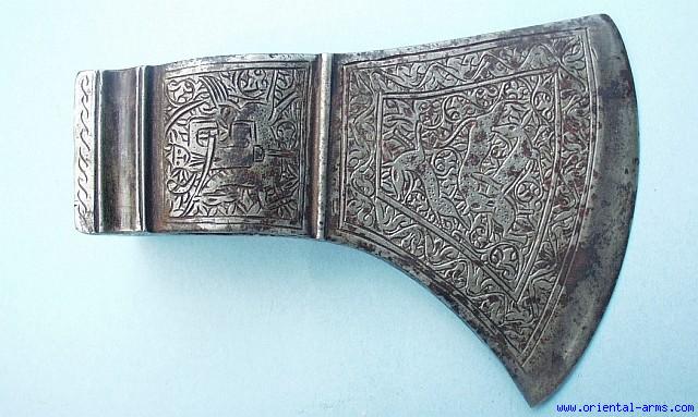 It is not common to se such a decorative high Quality Tabar axe head on sale. The steel blade is 4 inches wide, sharp and heavy, 6 inches tall. Its entire faces all around are very delicately engraved and chiseled in the typical 19 C. Qajar style. Very good condition. Excellent age patina with minor blackened spots. |