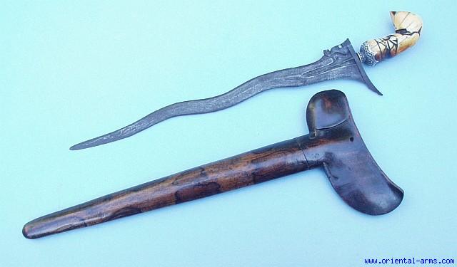 From our private collection we offer this beautiful Sumatra Keris dagger. Wavy blade 14 inches long, good pamor steel, with a beautiful lion figure chiseled at the blade base and set with gold dots on its foots. Ivory grip with a silver Mendak (new). Grained wood scabbard. Very good condition. The grip had a metal plaque on its back which is now missing. Age crack on the lower part of the scabbard. |