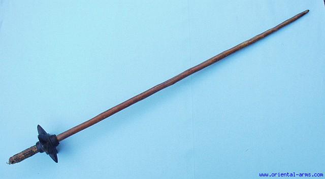 This is a 19 C. stone headed club from new Guinea, with a six pointed star shaped black stone head, 5 ½ inches in diameter, mounted on a 45 inches wood haft and secured in place by a braided rattan sleeve. Very good condition, good age patina on the stone and the haft and only minor chips on the stone head. Quite a scarce item and an important addition to any weapon / tribal art collection. |