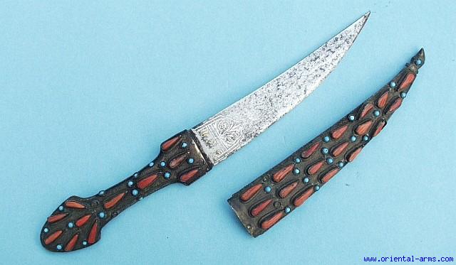 A very typical small curved dagger from the 19 C. The curved blade is 5 ½ inches long and decorated with gold koftgari. The hilt and scabbard are white metal, front side is gilded and set with corals and tiny turquoise stones. There are more than 29 corals and 33 turquoise stones set in this piece . This type of decoration was common in the 18 C. in the eastern parts of the Ottoman Empire. Very good condition. Some of the Koftgari decoration is worn.
