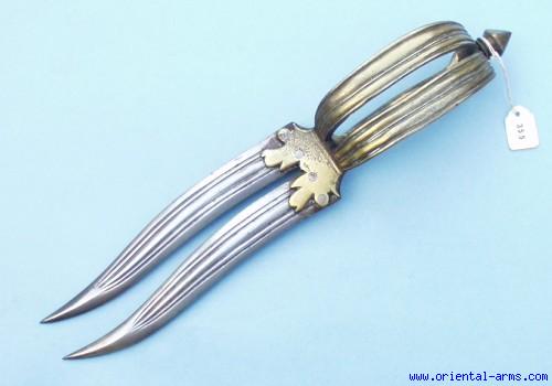 The blade of the Bichwa (literaly: Scorpion) may remind the scorpion sting. It characterized by a re-curving slender blade(s) and the loop or ‘ring’ hilt. It is an Indian weapon and comes in various shapes and sizes. This one is a double blade and has a brass hilt loop.