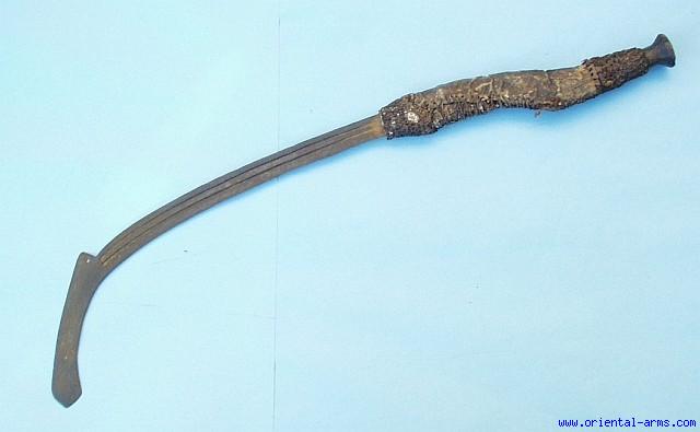 Up for sale this classical sickle shaped sword of the Azande from central Zaire (also used by the Boa, Azande neighbors). 20 inches blade fullered on one face and sharpened on the concave side with a 7 inches double edge tip. Wood handle bound with hide and braided fibers. Total length 33 inches. Good condition. Nice age patina on the blade. Very unusual and authentic handle cover.