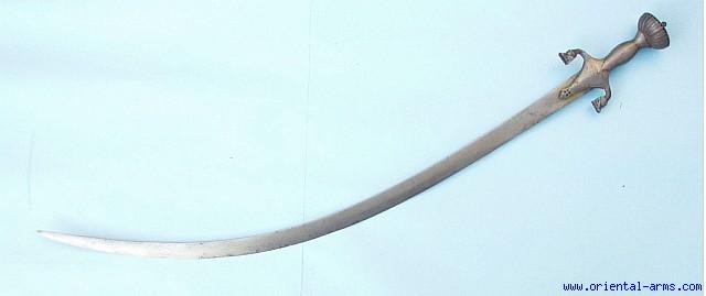 The Pulwar’ is the Afghan relative of the Indian Tulwar. The Pulwar hilt is of very distinct shape, with down curving quillons. This one employs a real good old Persian Shamshir blade, forged from fine wootz (Damascus) steel. Heavy, single edge, with a wedge cross section 33 inches long. The hilt is of classical shape Whole steel construction with pierced quillons and langet tips. No scabbard. Total length 39 inches. Very good condition. Several small blackened areas on the blade with minor pitted spots. Beautiful real fighting sword at a very reasonable price. |