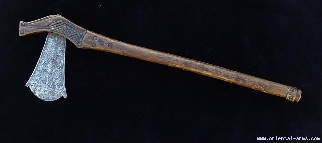 Up for sale is this ornamental axe from Africa, probably used by the Chokwe people of Zaire and Angola. Such axes were part of the outfit of all adult males and were carried suspended over the shoulder. This specific specimen with the engraved and decorated haft is a rare version and was carried by men of authority. Blade 5 X 2 ½. Haft length 23 inches. Very good condition. |