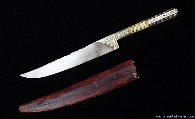 Up for sale is this very attractive knife from the East Mediterranean, probably Balkan or Turkish 19 C. 6 ½ inches single edge blade probably made from an old file. Finely filed and cut spine. Walrus ivory / horn grips set with small brass and mother of pearl rondels and set with engraved silver strips. Wood scabbard covered with red/brown leather. Total length 11 ½ inches. Good condition. Few rondells are mssing. Scabbard leather worn. |