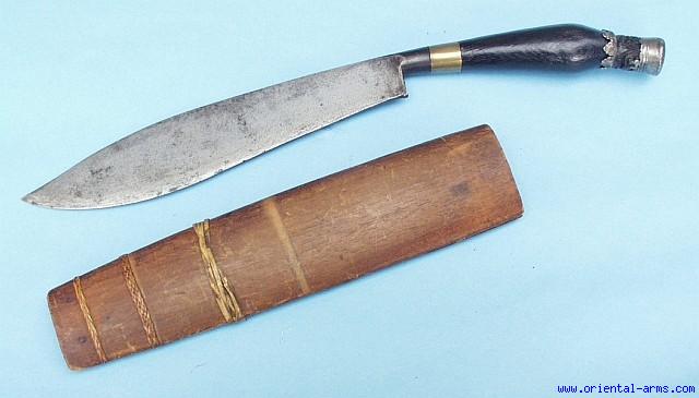 Up for sale is this heavy machete like knife. 10 inches heavy blade, 7 ½ inches black wood handle. Steel/brass bolster and silver decoration at the pommel. Wood scabbard bound with braided rattan bands ( few missing). The shape of the blade and the style of the handle suggest a Thai origin. Very good condition. Very low price.