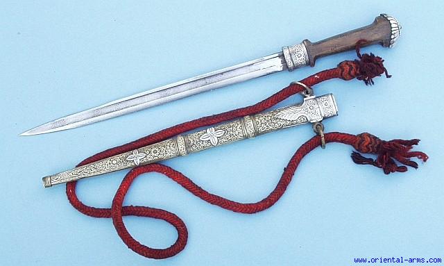 The Moroccan arsenal of blades includes also a variety of short straight daggers made from surplus blades: Broken swords, trade blades, bayonets and the like. They all bear very distinct Moroccan style in material and decorations and known in the name of JANWI, probably a local distortion of the name Genoa, a source for similar straight daggers. Here is a very nice example with a blade made from a early military bayonet, 13 inches long. Grip made from a massive single piece of Rhino horn with a distinct fibrous structure and set with silver fittings. The scabbard is made of brass and silver, chiseled in a classical Moroccan pattern. The scabbard come with its original red baldric carrying rope. Very good condition |
