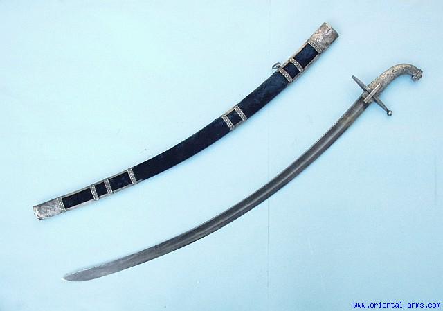 Not so common to find these kind of swords in this excellent condition: A fine sword / saber from east Europe, may be Hungarian. A military style blade, 32 inches long. Silver handle and cross guard. Silver mounted scabbard with blue velvet cover. All the silver parts are proof marked. All the silver fittings are set with carved corals showing human faces. An exquisite piece of art. Total length 38 inches. Very good condition. The velvet cover is slightly damage and so is the tip of the chape. A rare find for the connoisseur collector |
