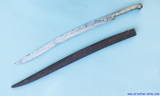 Up for sale is this very nice and complete Yataghan sword. A classical down curving blade, 22 ½ inches long. Marked with a maker sign, inscribed in Arabic lettering and dated on the spine to 1225 (1810 in the Gregorian Calendar). The hilt is chiseled silver. The scabbard is wood, covered with the original fine tooled leather stitced in the spiral stitching. Total length 33 inches. Good condition. There is a later repair to the right pommel ear and the scabbard tip is a bit worn. |