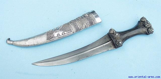 A dagger of high quality and decoration, of Turkish origin, most probably from East Turkey, with strong Kurdish / Iraqi influence. Late 19 Century. Superb 9 inches curved blade with a central rib forged from very fine wootz (Damascus) steel. Black horn hilt set with six silver buttons decorated with fine granulation work. The scabbard is whole silver on wood, rich in filigree decoration of the utmost quality. Total length (in scabbard) 16 inches. Very good condition. |