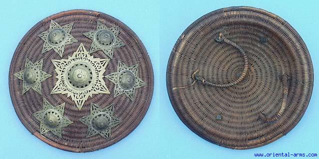 The Ache people of Central Sumatra are carrying this round hand shield (or Buckler) which is also locally known as .Peurise Awe. It is 13 ? inches in diameter, made of spiral cane densely braided with Rattan fibers. It is decorated with engraved and pierced six pointed brass stars, 6 around and a big central one. This is an authentic, very early 20 C. piece in excellent condition. |