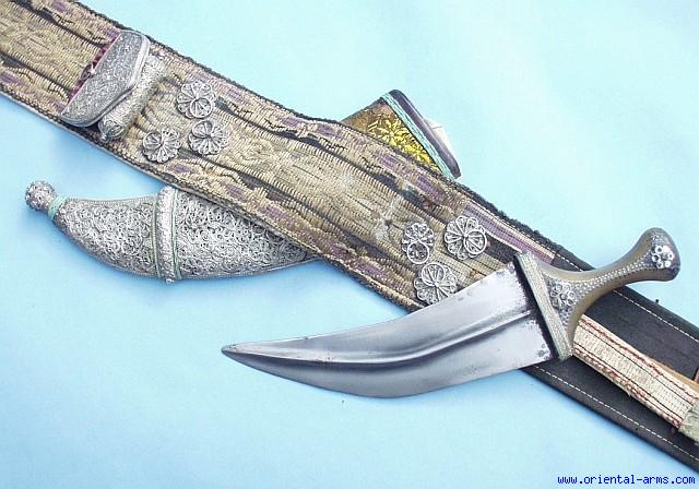 A real, authentic mid 20 C. Jambiya dagger from Yemen, with its original belt. The massive blade is 8 inches long, almost 3 inches wide, curved and double edge. The grip is Rhino horn with clear fibrous structure, set with silver rosettes and nails decorative design. The scabbard is wood, covered with colored velvet fabric and mounted with very big pierced silver chape in a delicate filigree work. Total length (in scabbard) 15 ½ inches. This dagger comes with its original brocade belt, 40 inches long, 3 ¾ inches wide, braided with golden threads and mounted with silver buttons, talisman pocket and steel buckle. All silver parts are proof marked. Very Fine condition. A very good piece. |