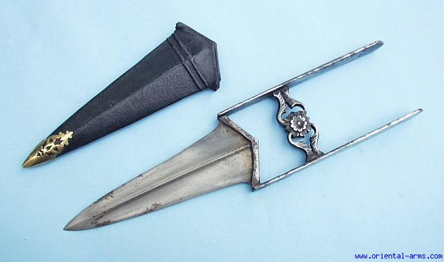 This is a very fine 19 Century Armor piercing Kattar push dagger, forged from very fine wootz (Damascus) steel with clear high contrast pattern. . The blade is 7 ½ inches long, with a central rib and slightly thickened tip. The cross bars is beautifully chiseled with a flower pattern. This kattar dagger comes with its original leather covered scabbard with original pierced brass tip. Total length 16 inches. Very good condition with few minor pitted spots on the blade. |